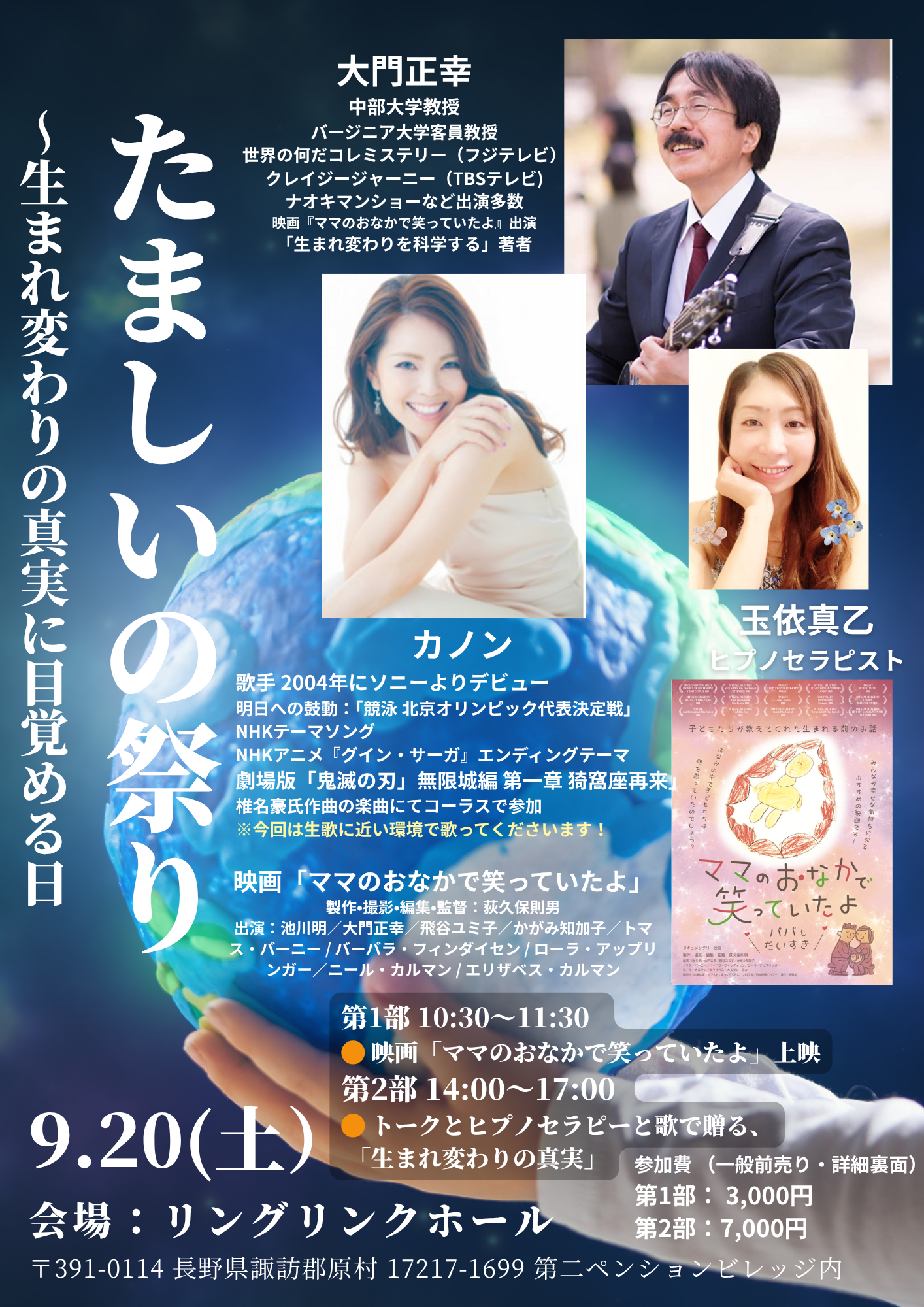 2025年9月20日、八ヶ岳で開催される「たましいの祭り」でカノンさん、真乙さんとご一緒させていただきます。カノンさんは『鬼滅の刃〜無限城編』で美声を披露されている実力派のシンガー、真乙さんはたくさんのヒプノセラピストを育ててこられた愛溢れるセラピストさんです。午前は荻久保則男監督の『ママのおなかで笑っていたよ』の上映会も開催。詳細はこちらをごらんください。