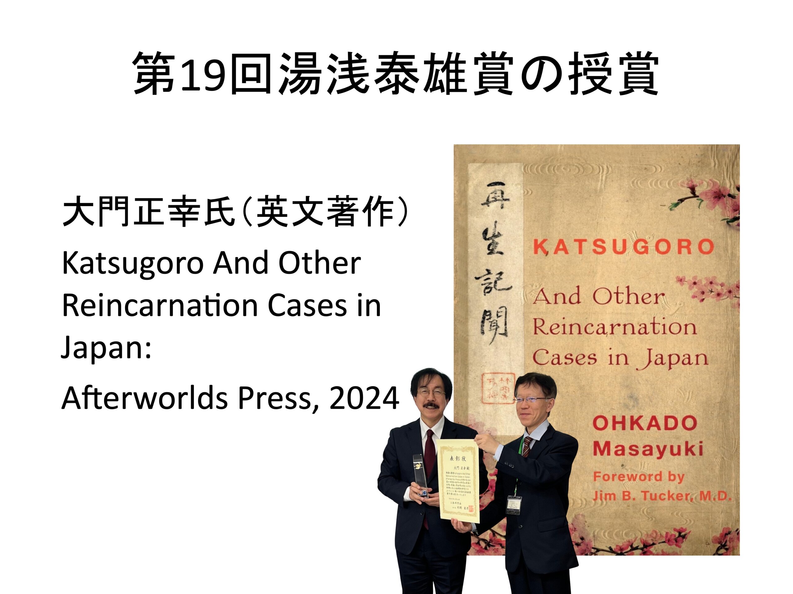 人体科学会湯浅賞(著作賞)受賞いたしました 研究紹介 2025.12.15 2025年12月13日〜14日に清泉大学で開催された人体科学会第35回大会の会場で湯浅賞(著作賞)をいただきました。対象は英文の Katsugoro and Other Reincarnation Cases in Japan, (2024, Afterworlds Press) です。