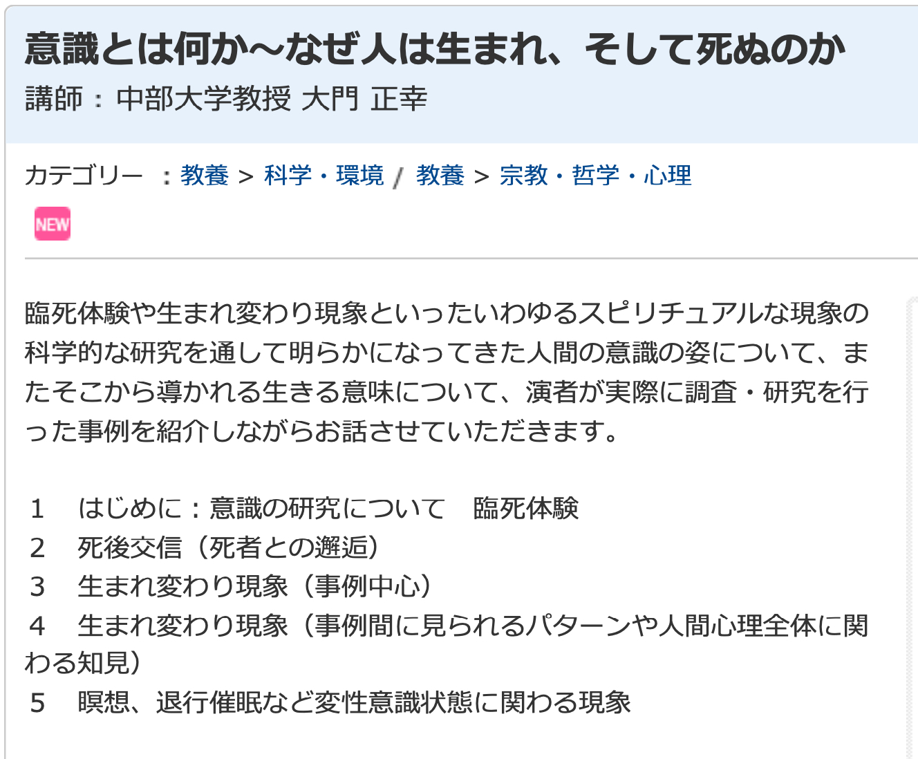NHKカルチャー連続講座 講演Screenshot 2026.04.01 2026年5月24日から「意識とは何か〜なぜ人は生まれ、そして死ぬのか」のタイトルで5回連続の講義をさせていただきます。詳しくはこちらをごらんください。 Screenshot